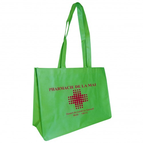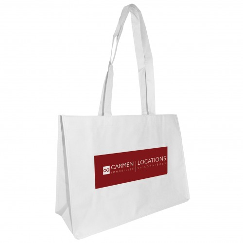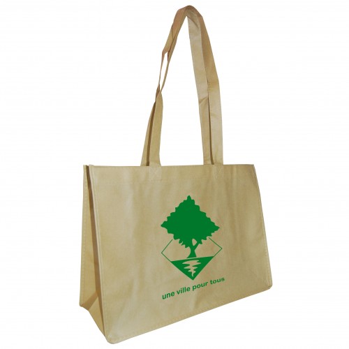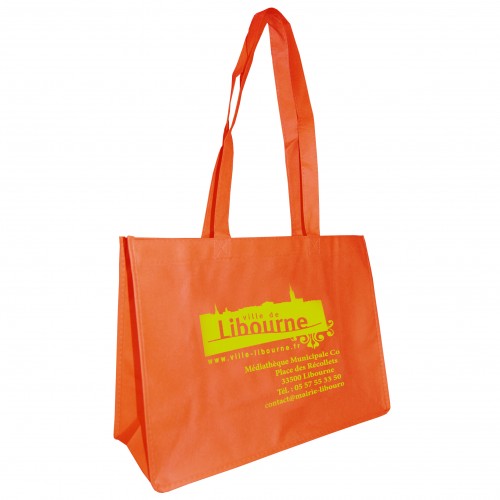 Sac non tissé, 80grs. Marquage en sérigraphie au recto/verso 1 couleur ou au recto 2 couleurs (ne se touchant pas). Fonds : vert, blanc, noir, orange et sable. Anses épaules souples. *Suivant les matières, les couleurs d'impression peuvent comporter de légères différences de nuances.