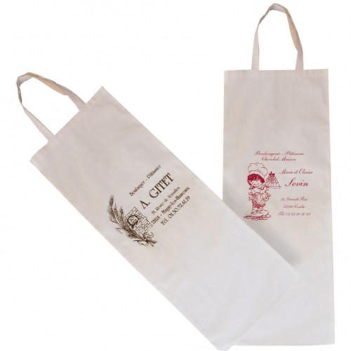 Sac à pain en coton, 130grs. Marquage en sérigraphie au recto/verso 1 couleur ou au recto 2 couleurs (ne se touchant pas). Poignées rondes et souples en coton. Fond : naturel. Format 300x750mm avec une surface d'impression de 200x250mm. *Suivant les matières, les couleurs d'impression peuvent comporter de légères différences de nuances.