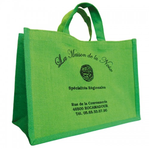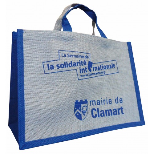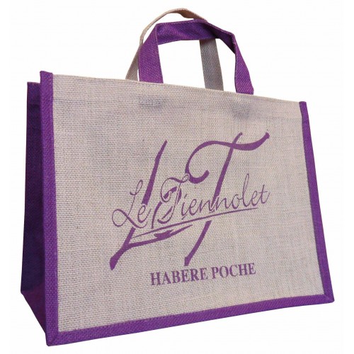Sac en jute, poignées en jute. Fond : naturel, bleu, violet et vert Format 360x200x270mm avec au choix surface d'impression de 240x180mm ou impression 1 couleur sur bandeau toile de jute 200x100mm, 4 lignes de texte. *Suivant les matières, les couleurs d'impression peuvent comporter de légères différences de nuances. arquage en sérigraphie au recto/verso 1 couleur ou au recto 2 couleurs (ne se touchant pas).
