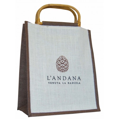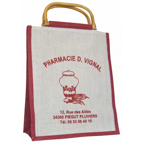 Sac en jute, poignées en bambou. Fond : Blanc/Marron, Blanc/Vert et Blanc/Bordeaux. Format 300x170x350mm avec au choix surface d'impression de 200x250mm ou impression 1 couleur sur bandeau toile de jute 200x100mm, 4 lignes de texte. *Suivant les matières, les couleurs d'impression peuvent comporter de légères différences de nuances. Marquage en sérigraphie au recto/verso 1 couleur ou au recto 2 couleurs (ne se touchant pas).
