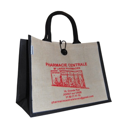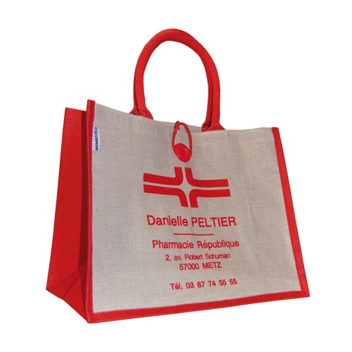 Sac en juco : mélange de jute et de coton. Avec pochette intérieure. Fermeture avec un bouton. Fonds : naturel/rouge et naturel/noir. Format 360x200x270mm avec une surface d'impression de 240x150mm. *Suivant les matières, les couleurs d'impression peuvent comporter de légères différences de nuances. Marquage en sérigraphie au recto/verso 1 couleur ou au recto 2 couleurs (ne se touchant pas). Pour une impression tout en finesse!